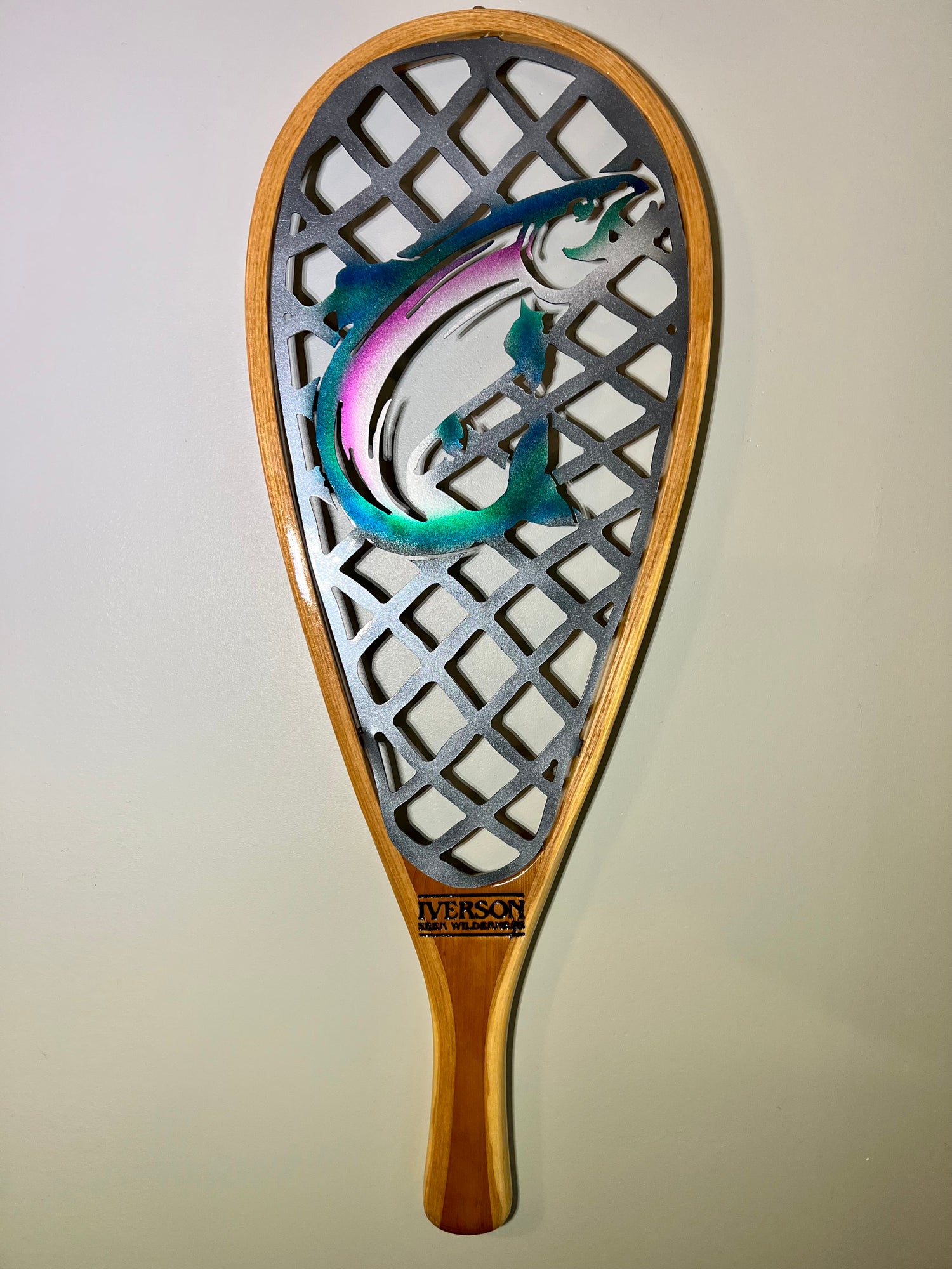 Laser cut metal fish image placed in our hand-bent fishing net.