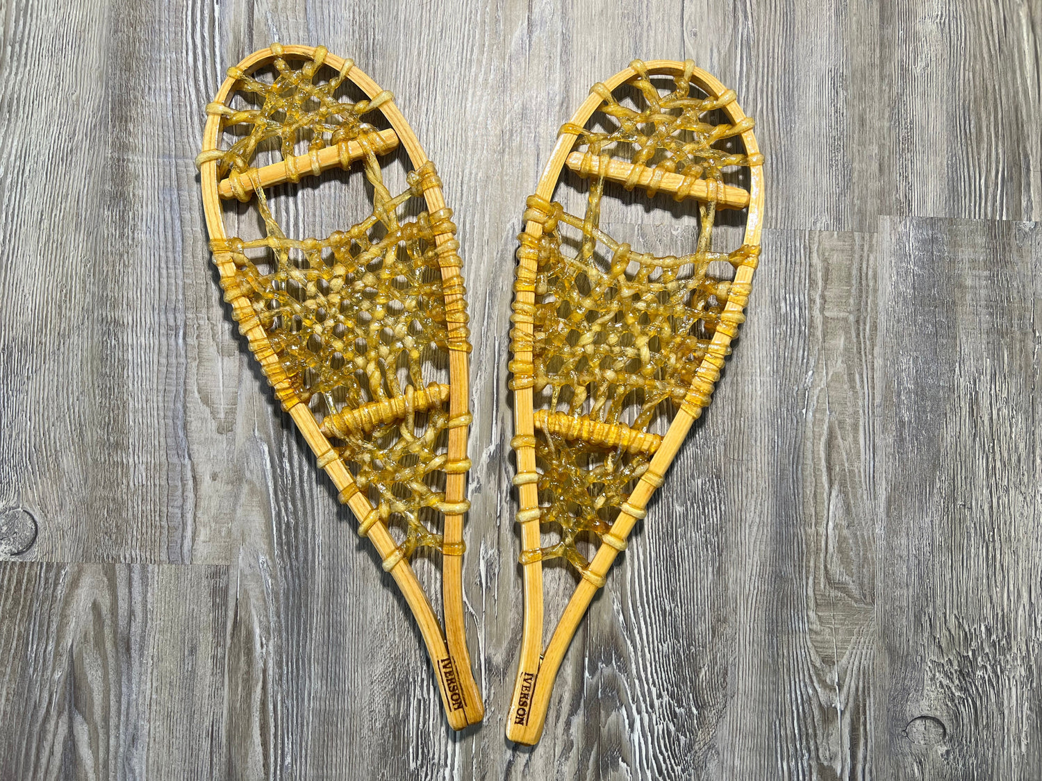 Made from steam-bent Michigan ash and hand woven with full grain rawhide these decorative shoes are 15 inches tall and 5 inches wide. Perfect to hang on a wall or place on a shelf to remember your last time out on the trail or dream about your next. Sold as a pair.