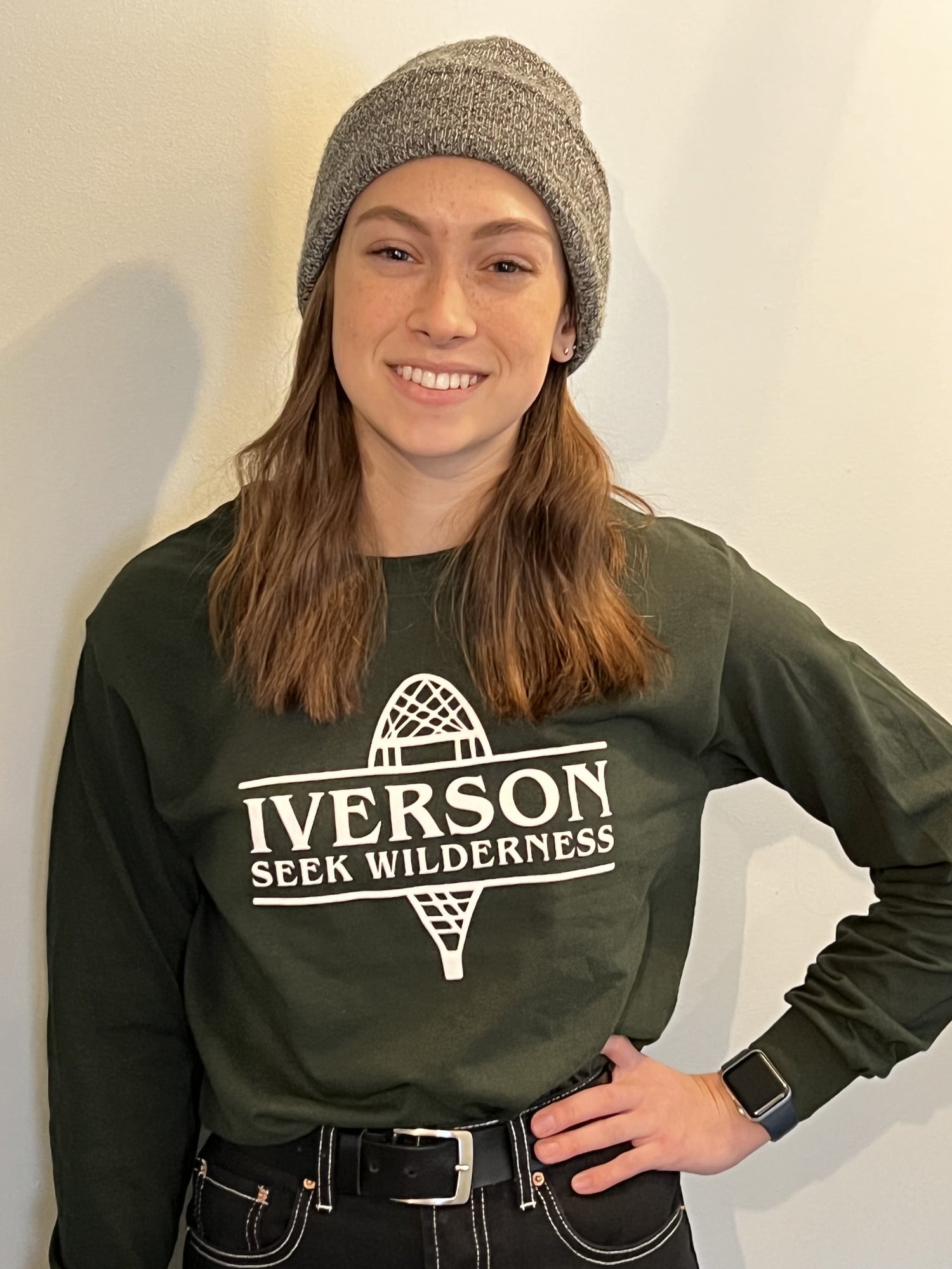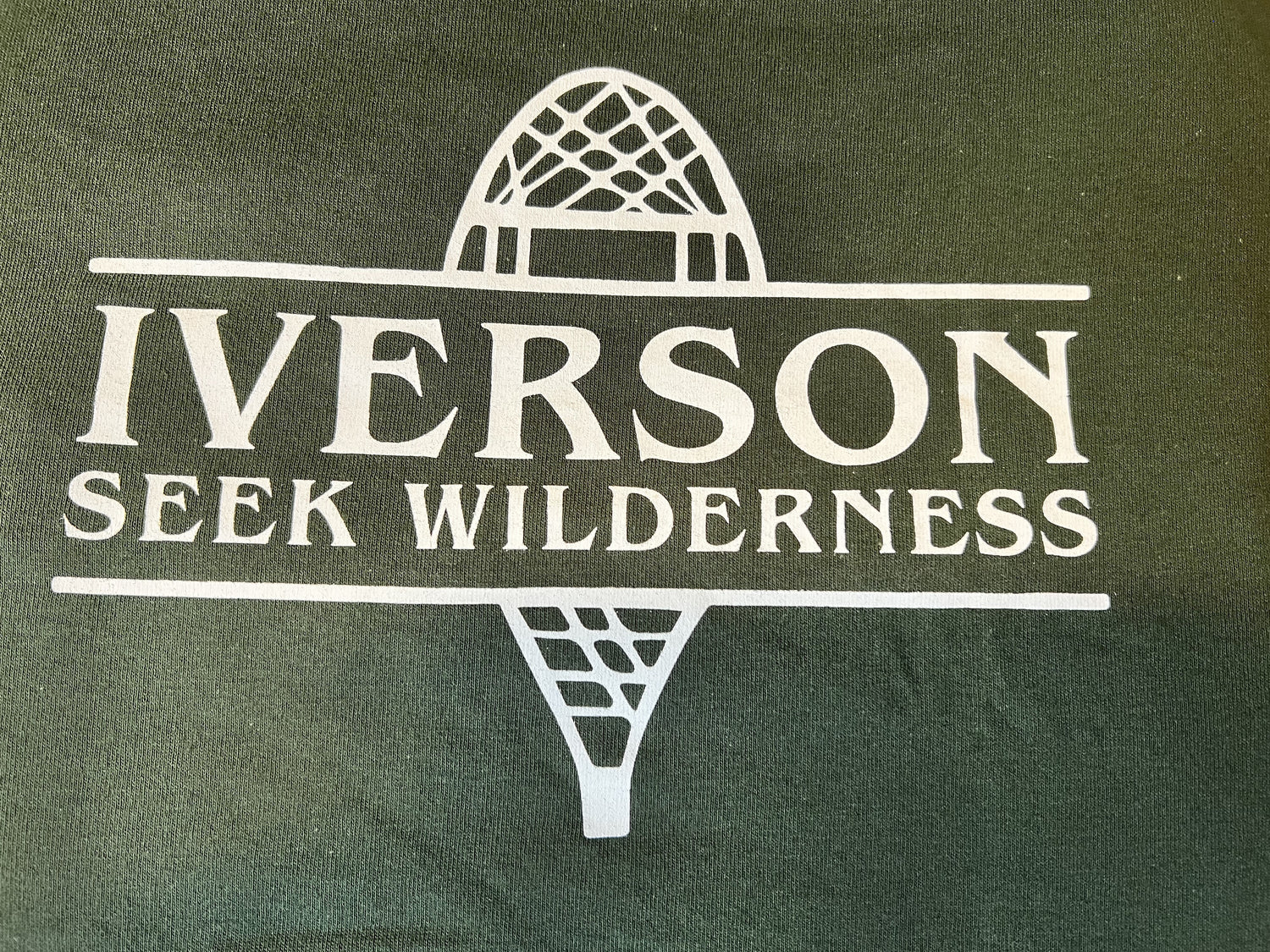 Forest Green Long-sleeve T-shirt with white "Iverson - Seek Wilderness" snowshoe logo.
